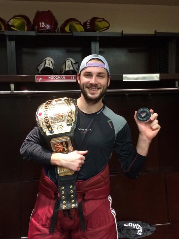 Kanadalaishyökkääjä sai pelin jälkeen kannettavakseen ottelun parhaan Coyotes-pelaajan palkinnoksi annettavan vyön. Katso kuva Hodgmanista alta (jos et näe kuvaa, katso se tästä):