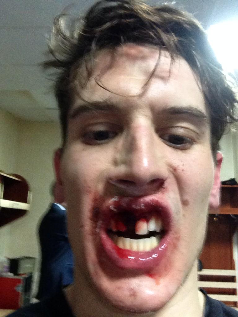 Jenkkitähti sai naamaansa ikävästi osumaa ja jätti kaukalon paikkausten takia.