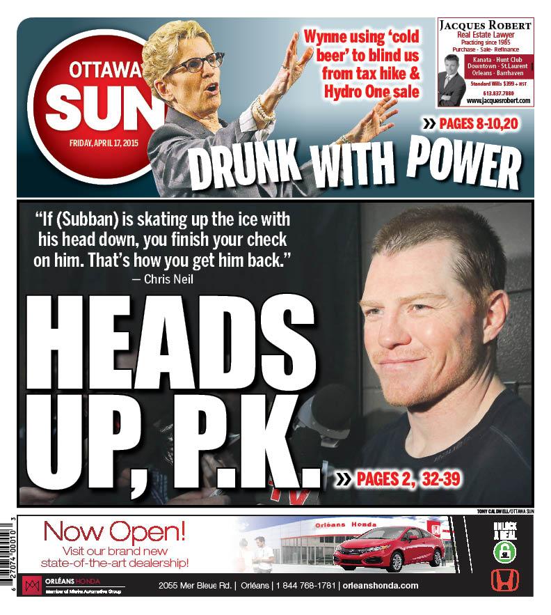 SUN FRONT: Game 2 btw #Sens & #Habs goes Friday. All we gotta say is HEADS UP, P.K. #ottnews #NHLPlayoffs #slashgate