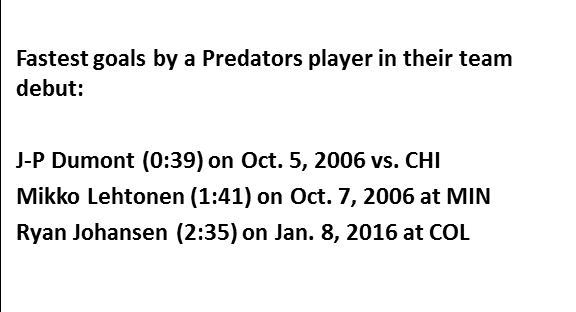 Via @EliasSports: @RyanJohansen19’s goal at 2:35 of 1st per. was 3rd-fastest by a @PredsNHL player in debut w/ team:
