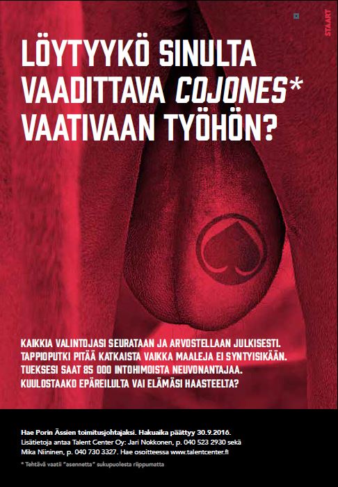 Ässät ei hae uutta toimitusjohtajaa perinteisellä tavalla.Hakuilmoituksessa on kuva härän kiveksistä, joissa on Ässien logo. Oheisessa tekstissä kysytään, että ’Onko sinulla vaadittava cojones* vaativaan työhön?’.