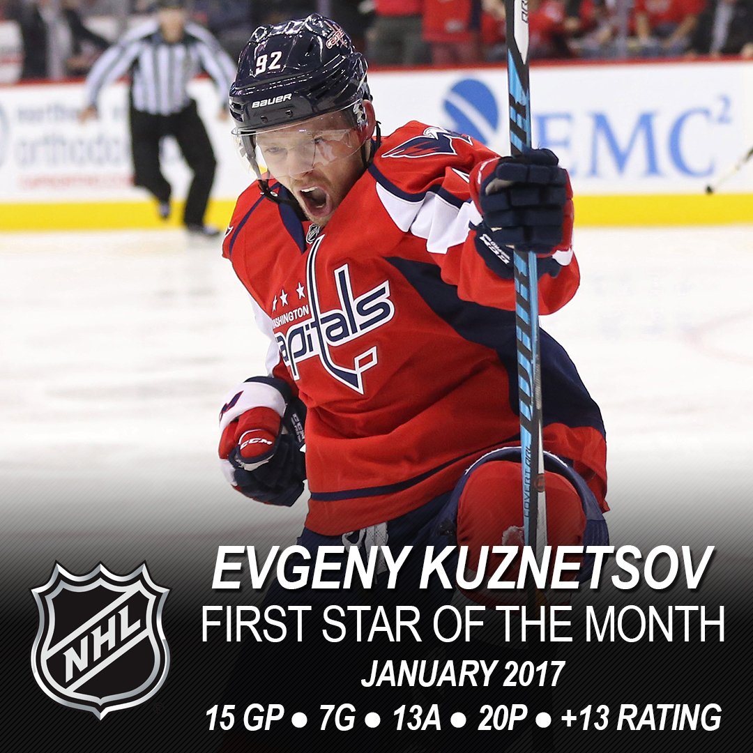 Evgeny Kuznetsov has been named the @NHL's "First Star" of the Month for January 2017! RT to congratulate, @Kuzya92! #RockTheRed