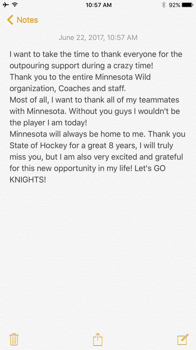 – Minnesota pysyy aina kotinani. Kiitos jääkiekko-osavaltiolle kahdeksasta upeasta vuodesta. Tulen todella ikävöimään teitä, mutta olen myös erittäin innostunut ja kiitollinen uudesta mahdollisuudesta elämässäni. Antaa mennä, Knights! Haula kirjoittaa.
