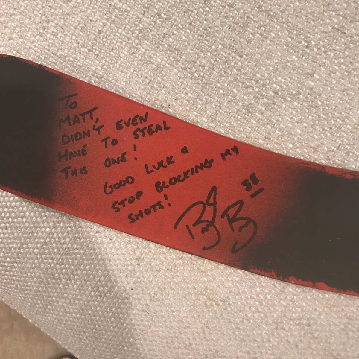 – Mattille: Sinun ei edes tarvinnut varastaa tätä! Onnea laukausteni blokkaamiseen! Burns väkersi allekirjoituksen kera.