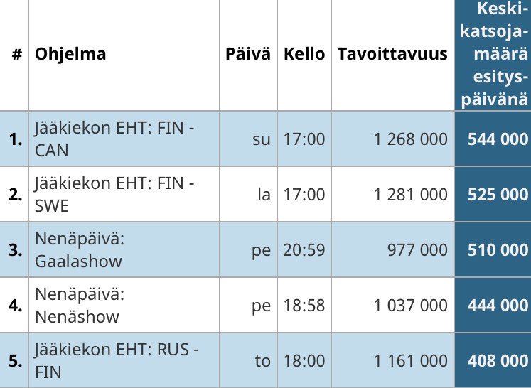 Myös torstain Venäjä-kamppailu tavoitti yli miljoona katsojaa Ylellä (1 161 000). Silloin keskiarvo oli 408 000 katsojaa.