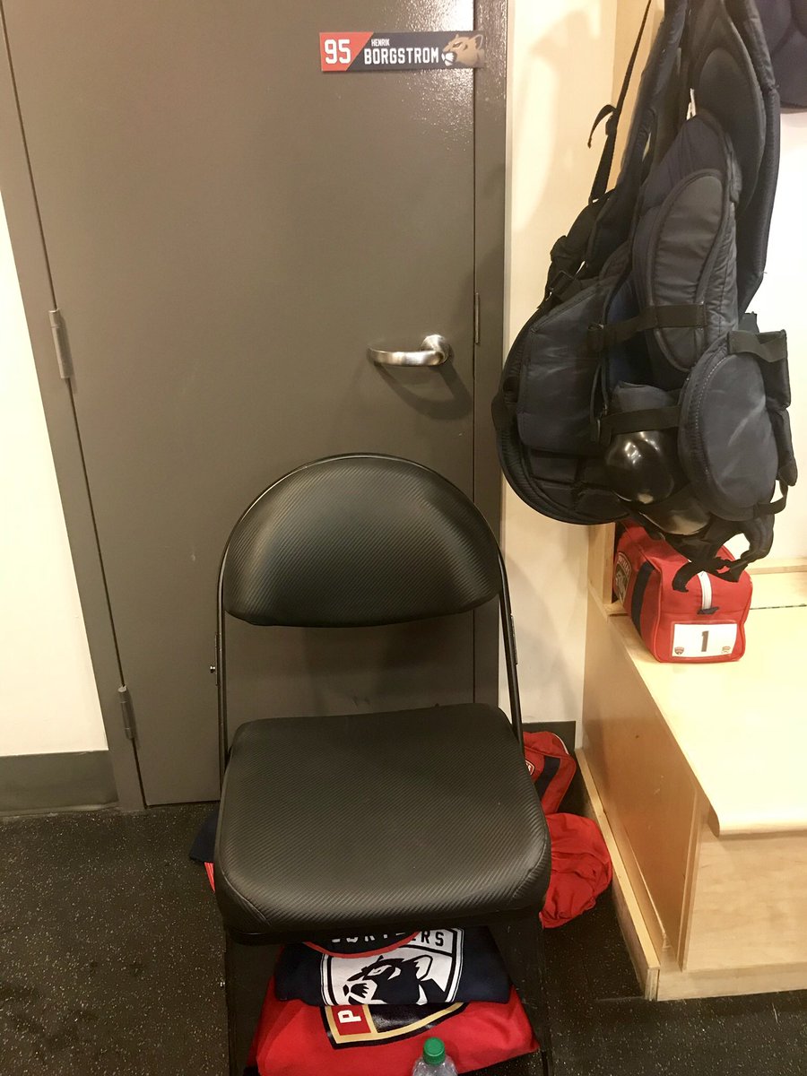 Borgström ei tee poikkeusta. Hänen paikkansa pantterilauman pukukopissa on, ainakin toistaiseksi, hyvin riisuttua mallia. Musta, pehmustettu tuoli ja sen alla taitettuna pelipaidat, hupparit ja muut seuran logolla varustetut vaatteet.