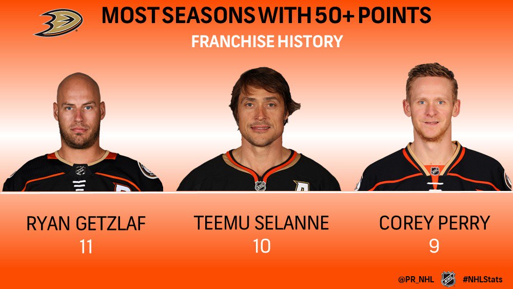 Ryan Getzlaf scored to reach the 50-point mark for the 11th time in his career and establish a franchise record for the most such seasons in @AnaheimDucks franchise history. #NHLStats #ANAvsDAL
