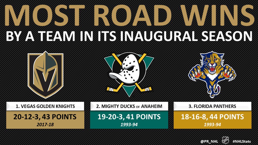 The @GoldenKnights established an NHL record for most road wins by a team in its inaugural season. #NHLStats #VGKvsBUF