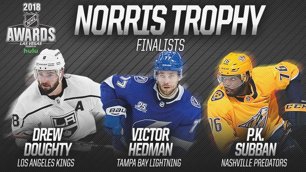NHL-toimittajien yhdistys äänesti kolmen parhaan puolustajan joukkoon Los Angeles Kingsin Drew Doughtyn, Tampa Bay Lightningin Victor Hedmanin ja Nashville Predatorsin P.K Subbanin.