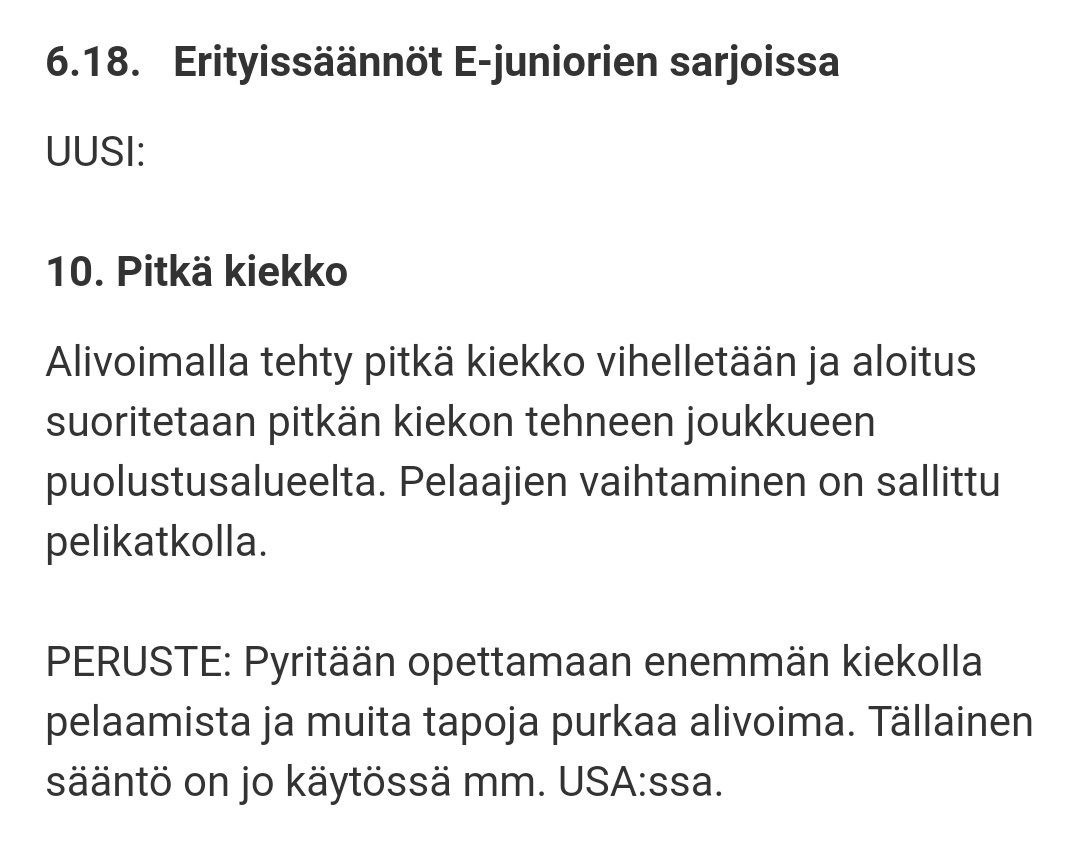 E-juniorien sarjoissa otetaan ensi kaudella käyttöön uusi erityissääntö, jonka myötä alivoimalla tehty pitkä kiekko johtaa vihellykseen ja aloitukseen pitkän kiekon tehneen joukkueen puolustusalueella. Myöskään pelaajien vaihtaminen ei ole sallittua pitkän kiekon tehneelle joukkueelle.