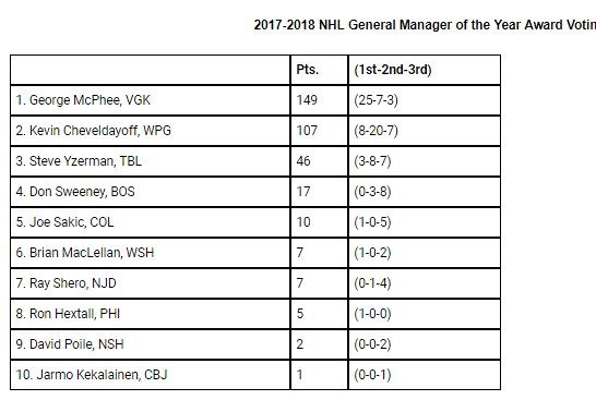 Äänestyksen voitti ylivoimaisella äänivyöryllä Vegas Golden Knightsin George McPhee.