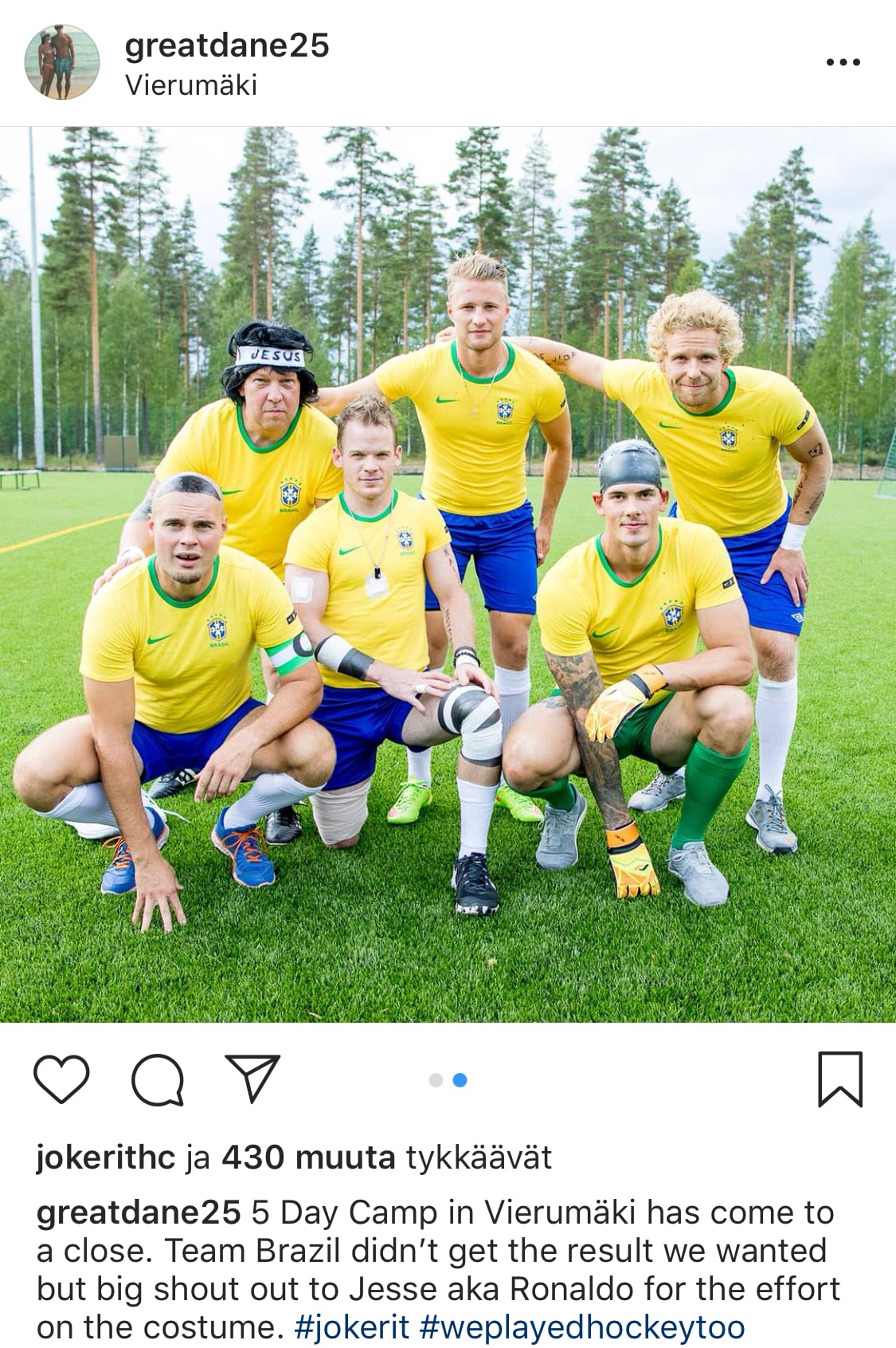 Perjantaina Instagramiin julkaistut kuvat paljastavat myös, että hauskaa on osattu pitää. Puolustaja Oliver Lauridsen nimittäin julkaisi pelaajista hulvattomia kuvia Brasilian maajoukkueen pelipaidat päällä.