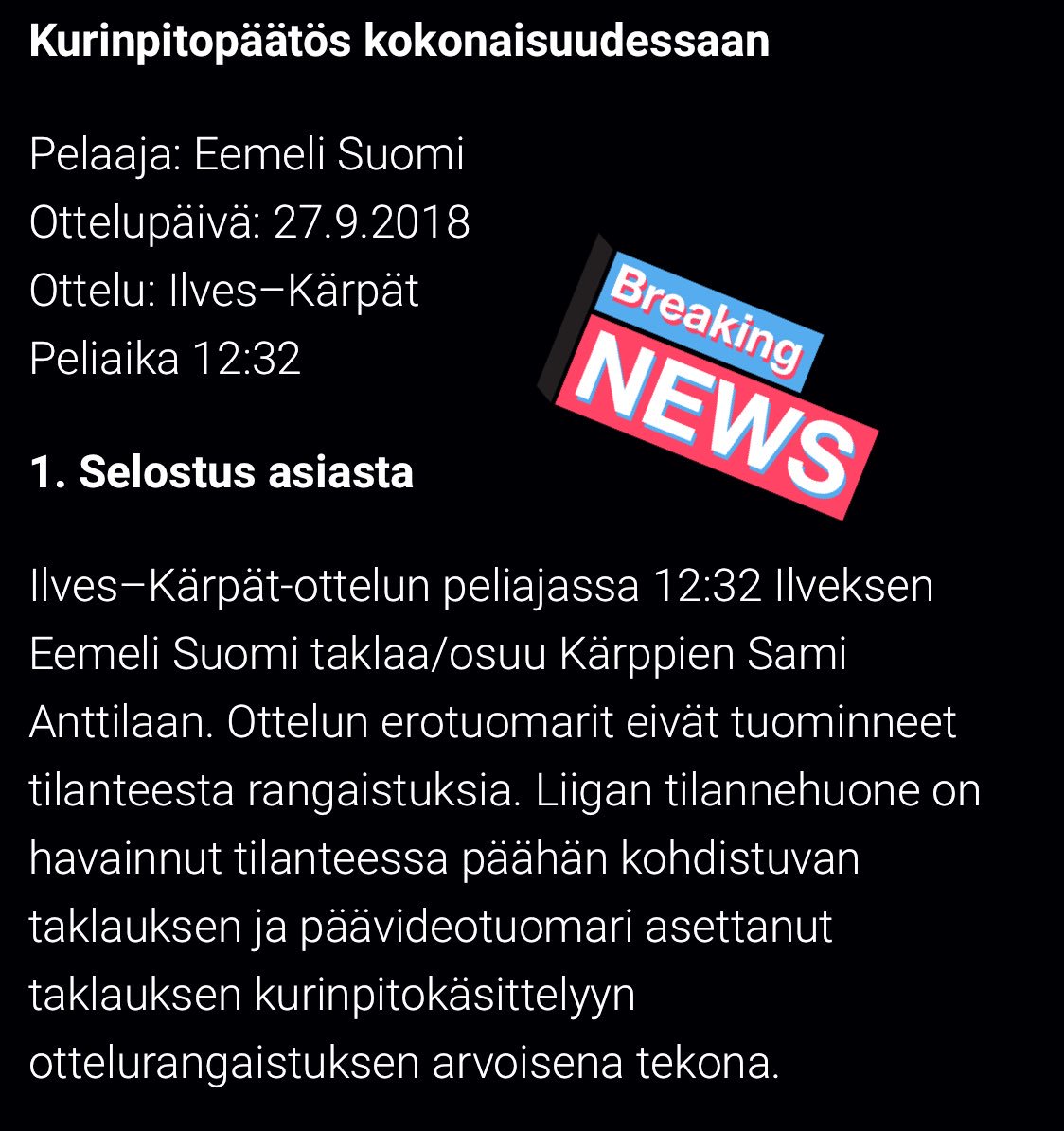 #Ilves -kapteeni Eemeli Suomi sai pelikieltoa torstain #Kärpät -ottelun tapahtumista.