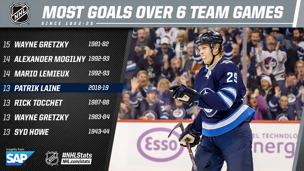 Kaiken lisäksi Laine on tehnyt kuuteen edellisotteluun ällistyttävät 13 maalia, eikä tähän ole kyennyt NHL:n historiassa kaudesta 1922-23 lähtien kuin kuusi pelaajaa.