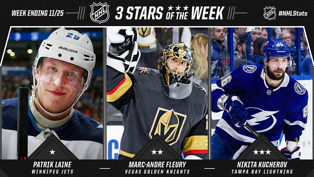 Patrik Laine (@NHLJets), Marc-Andre Fleury (@GoldenKnights) and Nikita Kucherov (@TBLightning) named the NHL’s “Three Stars” for the week ending Nov. 25.