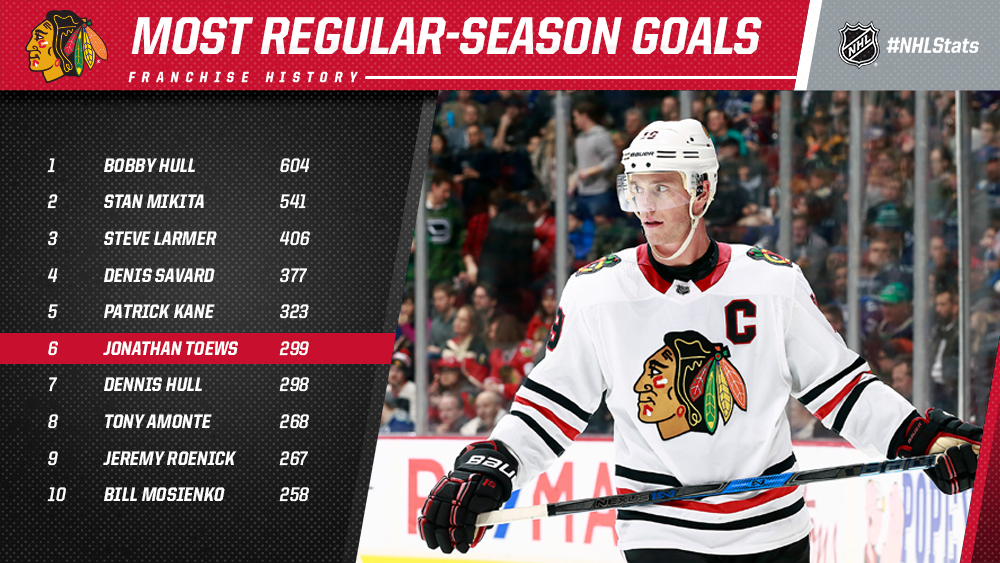 Jonathan Toews scored the 299th goal of his NHL career (all w/ CHI) to pass Dennis Hull (298) for sole possession of sixth place on the @NHLBlackhawks' all-time list. #NHLStats #CHIvsVAN