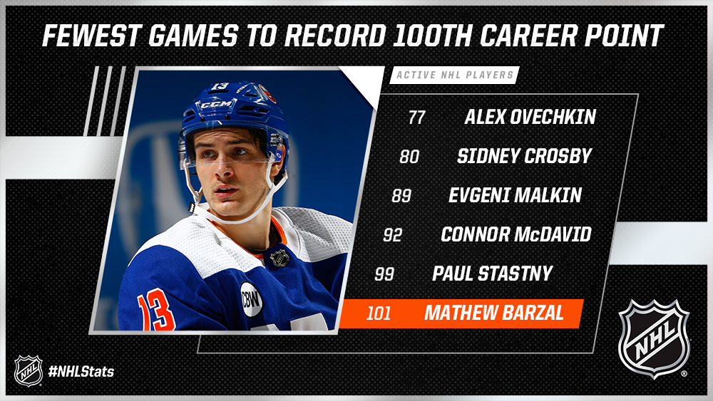 Häntä lyhyemmässä ajassa kolminumeroisen pistemäärän on rikkonut nimittäin vain viisi aktiivipelaajaa. Kyseessä on suhteellisen tiukka kvintetti: Aleksandr Ovetshkin (77 pelissä), Sidney Crosby (80), Jevgeni Malkin (89), Connor McDavid (92) ja Paul Stastny (99).