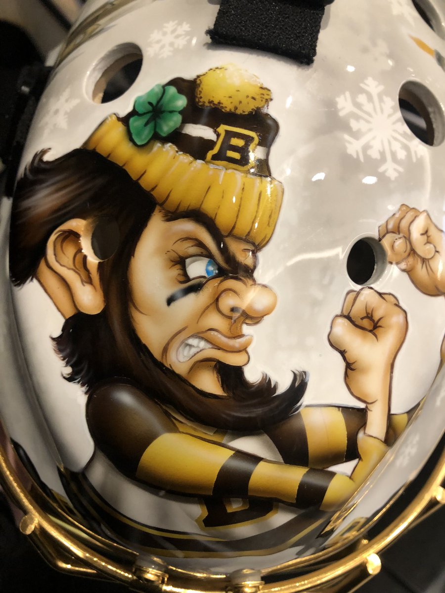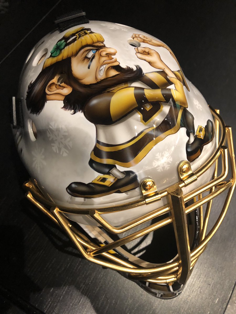 Maskiin on maalattu Notre Damen yliopiston amerikkalaisen jalkapallojoukkueen maskotti jolle on puettu Bruins-paita, sekä pipo.