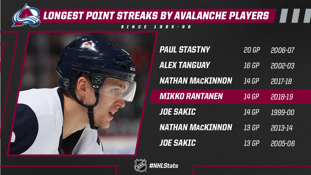 Mikko Rantanen extended his career-best point streak to 14 games, tied for the third-longest such run by an @Avalanche player since the club relocated to Denver in 1995-96. #NHLStats