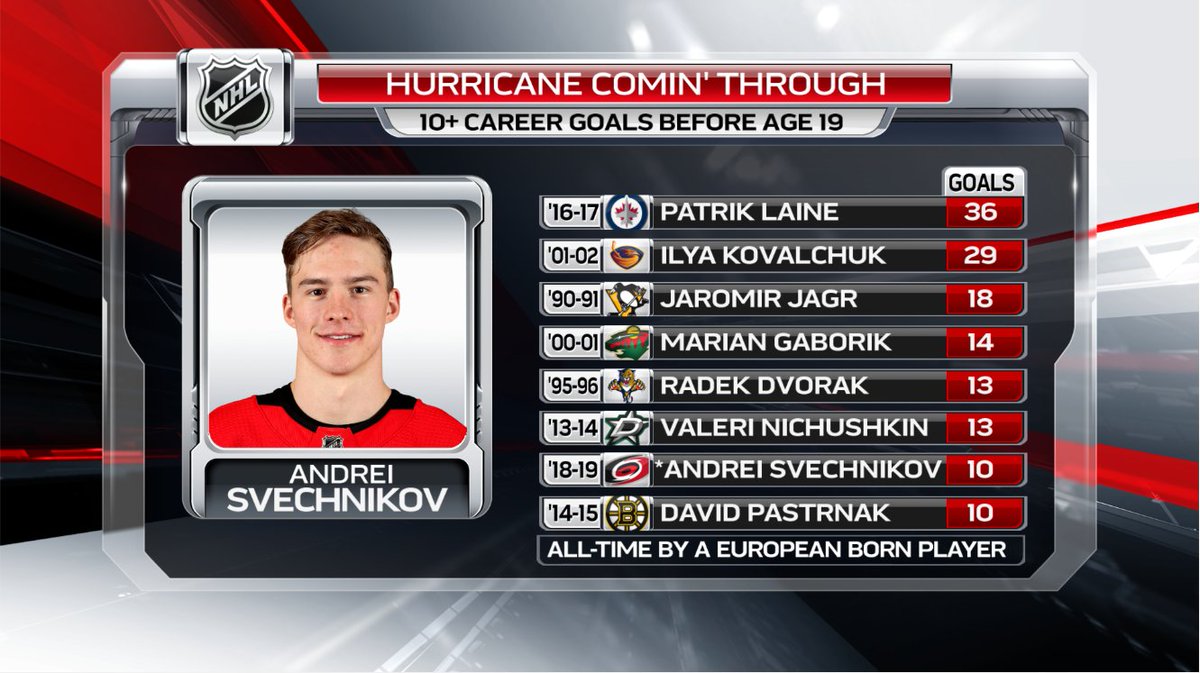 Though it came in a 4-1 loss to the Red Wings tonight, Andrei Svechnikov's lone goal for the #Hurricanes put the 18-year old Russian into some exclusive company on this list
