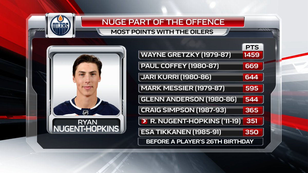 While never an elite offensive weapon, Ryan Nugent-Hopkins has been enough of an #Oilers mainstay & reliable scorer that with 2 assists tonight he's now 7th here (on a list mainly filled with dynasty-era names)