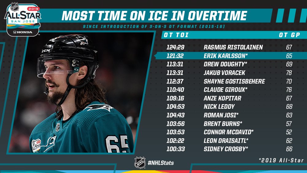 2019 NHL All-Stars are well represented among the Time on Ice leaders in OT since the 3-on-3 format was adapted in 2015-16. #NHLAllStar