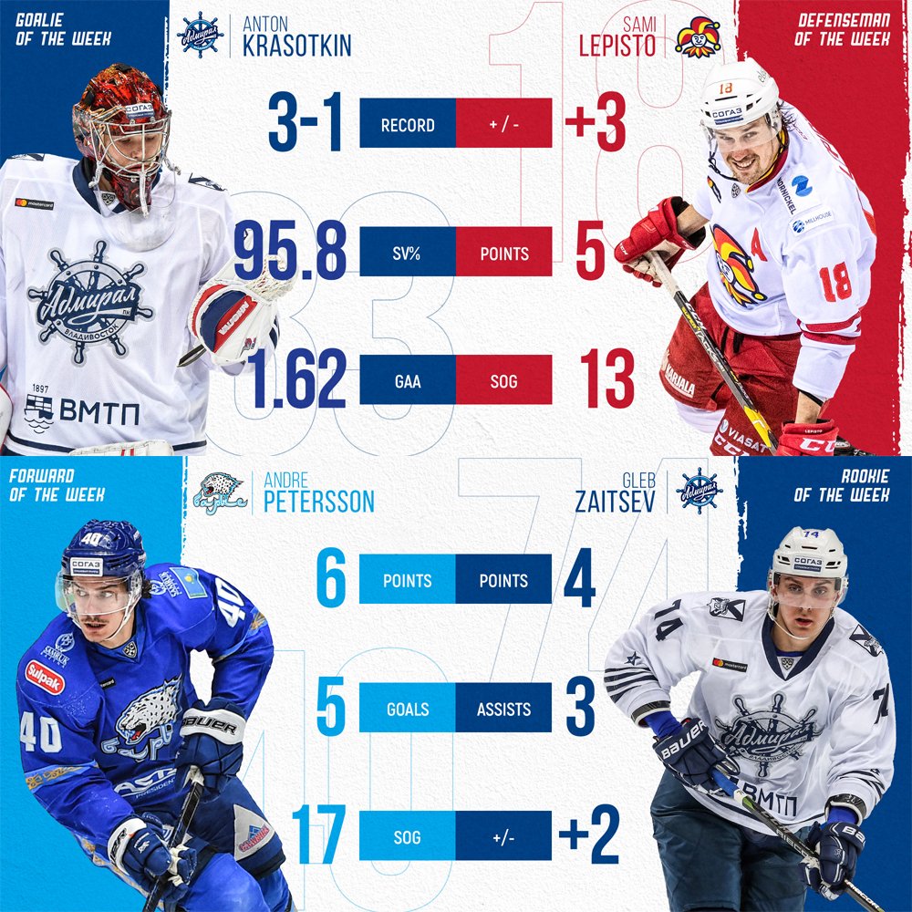 Parhaaksi maalivahdiksi valittiin Anton Krasotkin, parhaaksi hyökkääjäksi Andre Petersson ja parhaaksi tulokkaaksi Gleb Zaitsev.