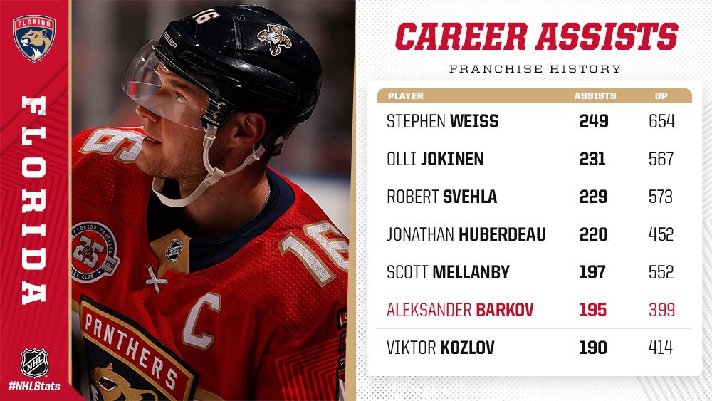 With the first ever five-assist game in @FlaPanthers history, captain @Barkovsasha95 moved into sixth place on the franchise's career assists list. #NHLStats
