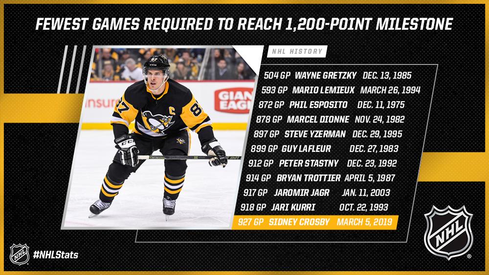 Crosby saavutti rajapyykin myös harvinaisen nopeasti. Häneltä kului aikaa 927 ottelua pistemäärän paukuttamiseen. Ainoastaan kymmenen pelaajaa on pystynyt samaan nopeammin.
