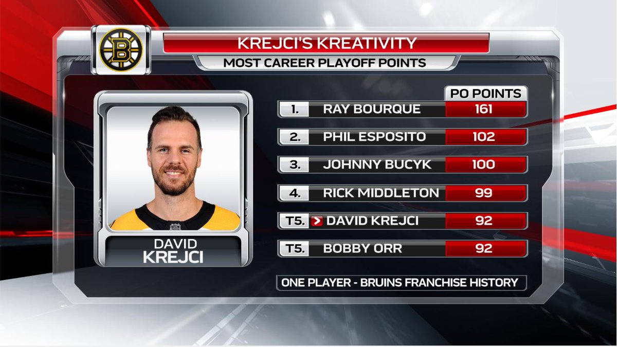 Though it was just a helper on the @NHLBruins 4-1 EN goal Tuesday, David Krejci's 92nd career #StanleyCup Playoff list tied him with an all-time legend of the game for 5th here