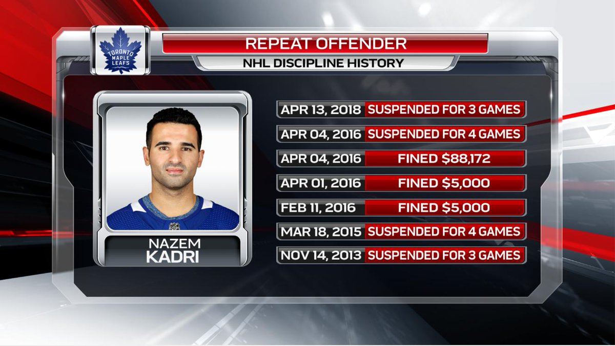 #Leafs centre Nazem Kadri's cross-check that got him ejected Saturday will likely result in a suspension, as his track record (shown here) for fines & suspensions has been lengthy for just a 6-year span