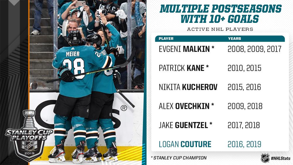 Logan Couture of the @SanJoseSharks is the sixth active NHL player to reach the 10-goal mark in multiple postseasons. #NHLStats #StanleyCup