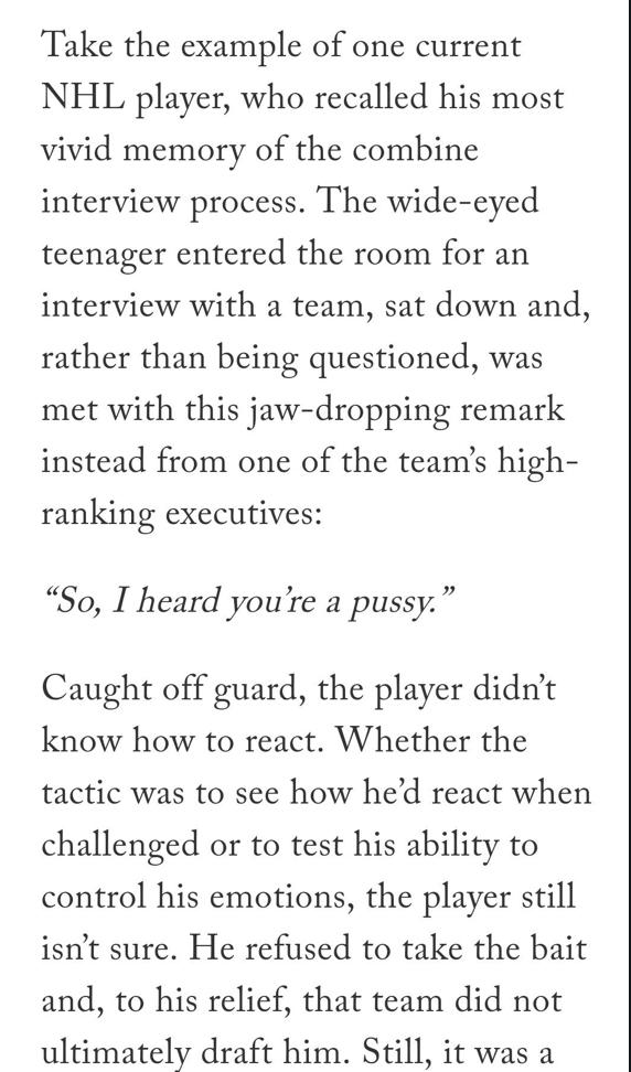 Yksi esimerkki kovuudesta on uusien pelaajien nappaamistapa joukkueisiin. Toimittaja Jack McGuire kertoi Twitter-tilillään, mitä eräältä pelaajalta oli kysytty NHL Scouting Combinessa.
