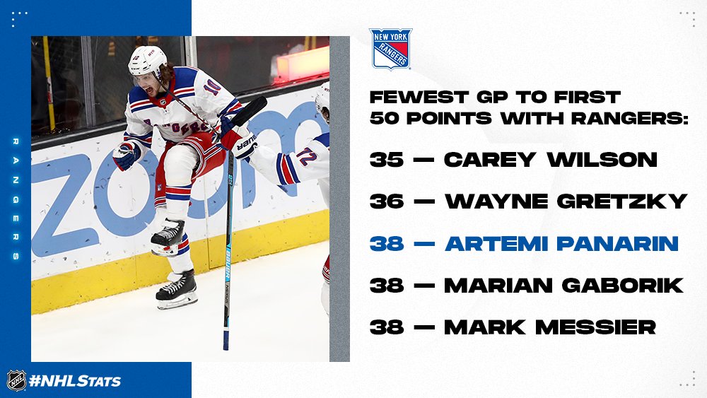 Artemi Panarin is the fifth @NYRangers player to record his first 50 regular-season points with the franchise in 38 games or less (NHL debut or otherwise). #NHLStats