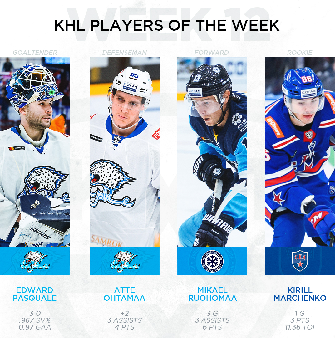 Sarjan viikon parhaaksi puolustajaksi valittiin Barys Nur-Sultanin Atte Ohtamaa, joka merkkautti viikon otteluissa tehot 1+3. Viikon parhaaksi maalivahdiksi noteerattiin saman seuran Edward Pasquale, joka torjui seuralleen kolme voittoa torjuntaprosentilla 96,7.