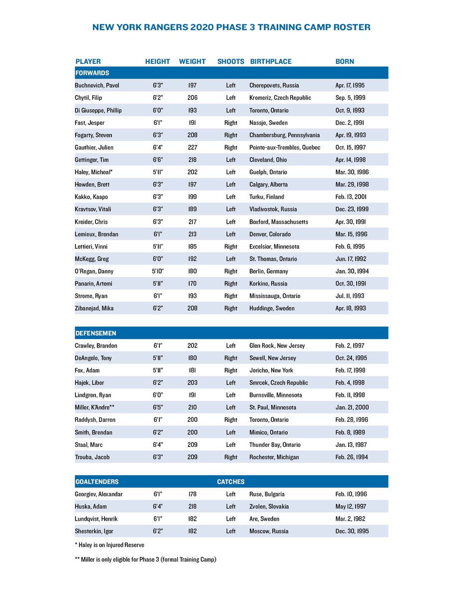 New York Rangers julkisti maanantaina Suomen aikaa alustavan kokoonpanonsa NHL:n jatkopeleihin.