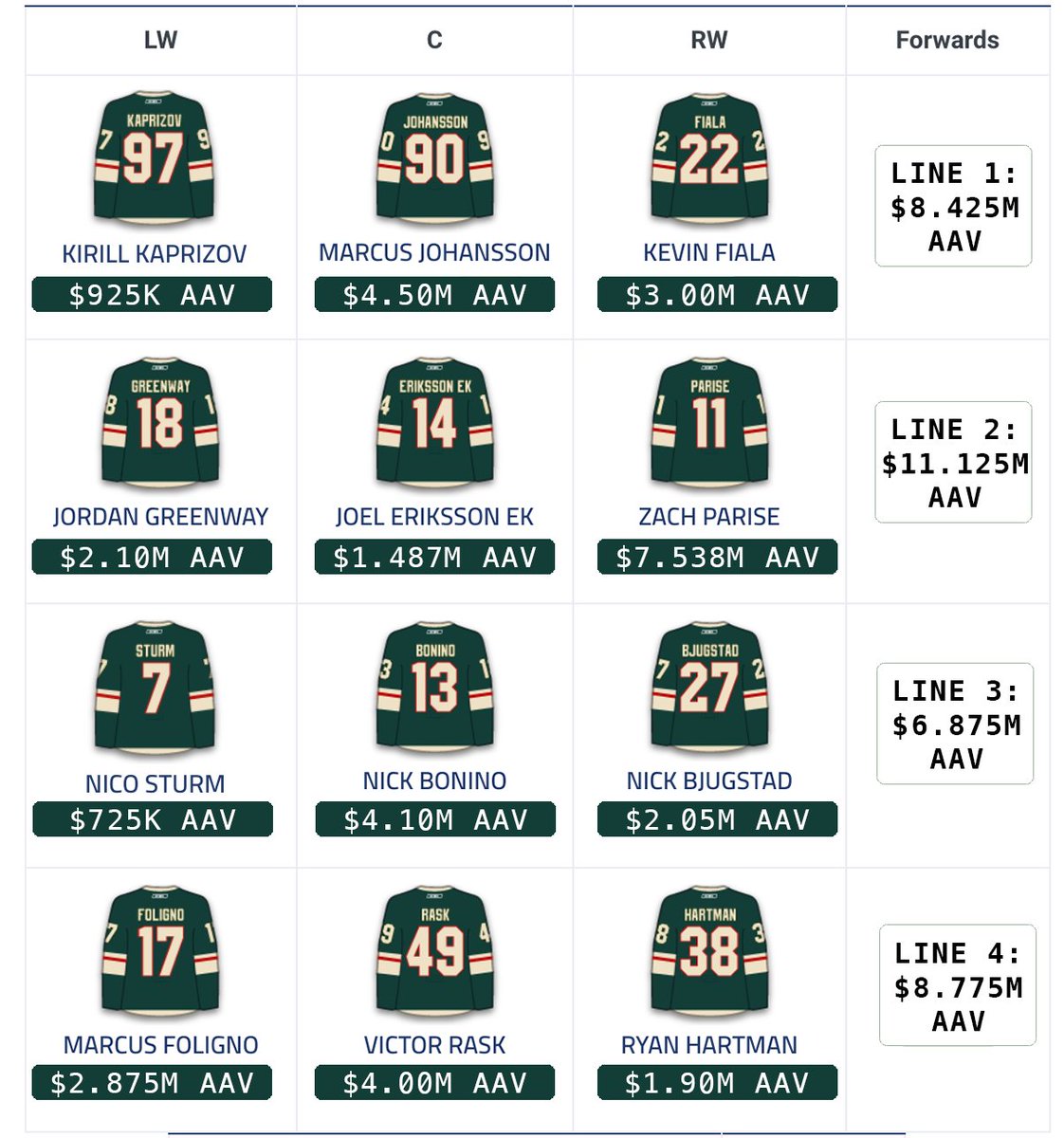 NHL-joukkueiden ketjukokoonpanoja julkaiseva suosittu DailyFaceoff-sivusto uskoo Kaprizovin pelipaikan löytyvän jo ensi kaudella Wildin ykkösketjusta Marcus Johanssonin ja Kevin Fialan rinnalta.