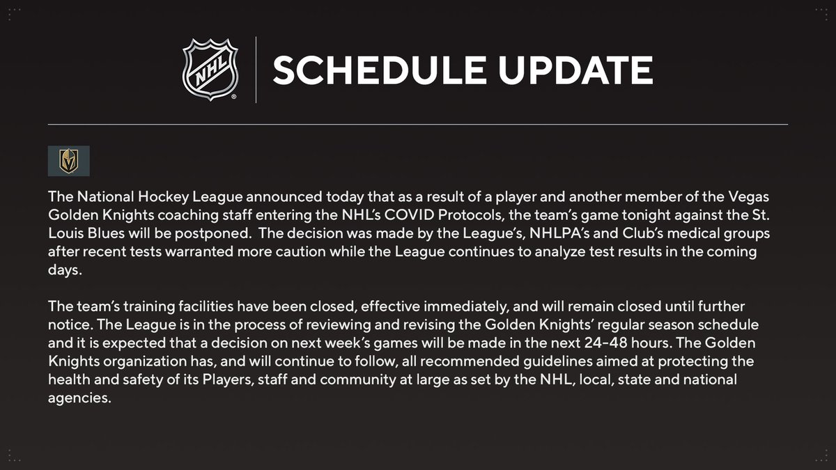 Syynä ovat Golden Knightsissa ilmenneet positiiviset koronatestitulokset. Yhdellä joukkueen pelaajalla, sekä yhdellä valmennusryhmän jäsenellä on todettu koronavirustartunta.
