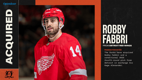 Red Wings lähettää hyökkääjä Robby Fabbrin ja ehdollisen 4. kierroksen (2025) varausvuoron Ducksille. Vastikkeena Red Wings saa 22-vuotiaan maalivahdin Gage Alexanderin.