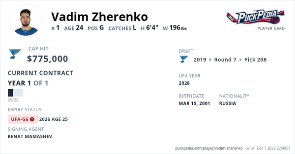 Zherenko, 24, on St. Louisin 7. kierroksen varaus (#208) vuodelta 2019. Kuluneella kaudella hän pelasi AHL:ssä Springfield Thunderbirdsissä 32 ottelua torjuntaprosentilla 89,7. Kolmen viime kauden aikana Zherenko on pelannut farmissa kaikkiaan 86 ottelua.