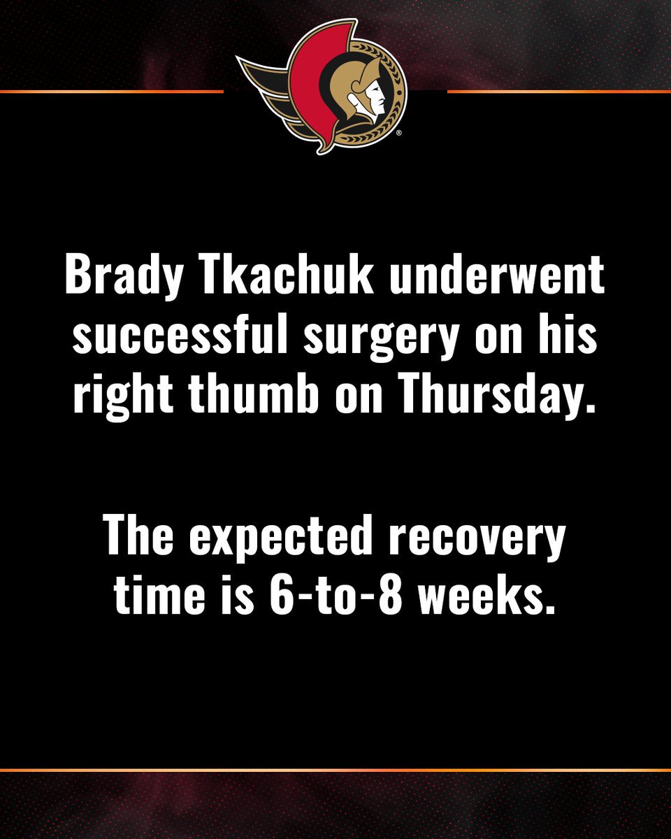 Ottawa Senatorsin supertähti Brady Tkachukin peukalo on leikattu torstaina ja miestä odottaa pitkä sairausloma, seura tiedottaa.