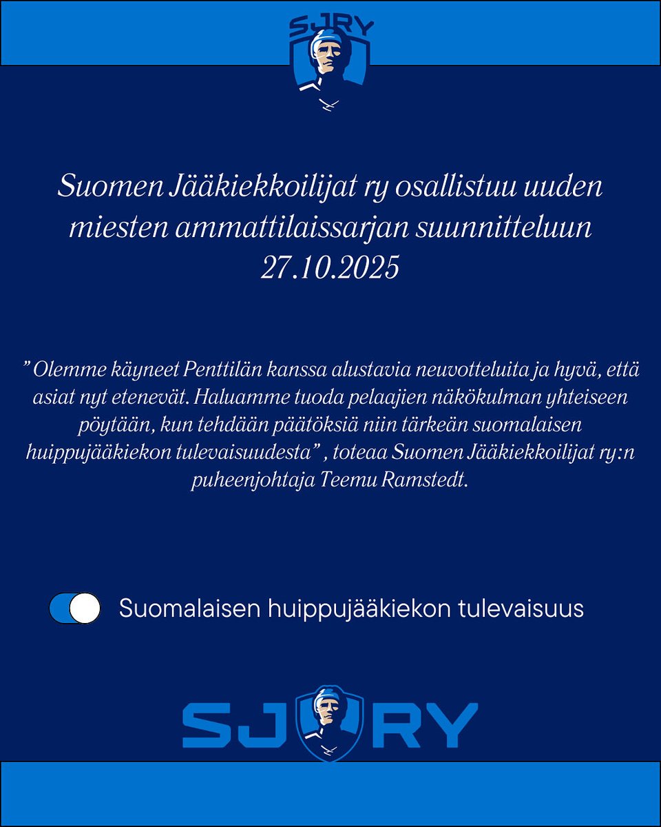 – Olemme käyneet Penttilän kanssa alustavia neuvotteluita ja hyvä, että asiat nyt etenevät. Haluamme tuoda pelaajien näkökulman yhteiseen pöytään, kun tehdään päätöksiä niin tärkeän suomalaisen huippujääkiekon tulevaisuudesta, toteaa SJRY:n puheenjohtaja Teemu Ramstedt tiedotteessa.