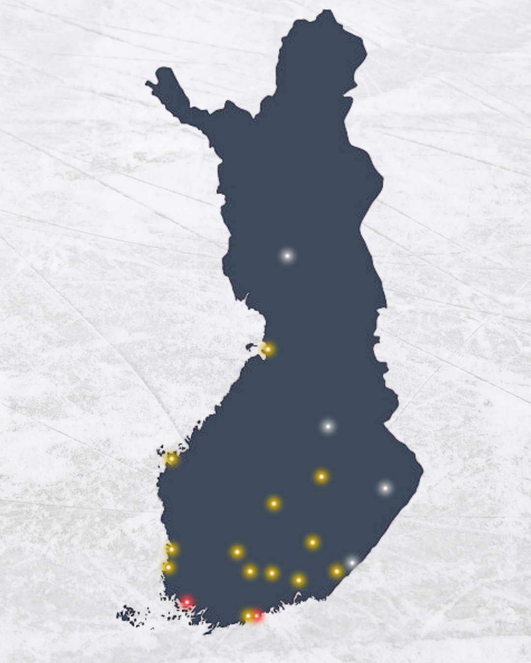 - Klo 15:41: Alla havainnekuva siitä, miltä kiekkokartta mahdollisesti näyttäisi jatkossa Suomessa. Kultaiset pisteet ovat kaupungit, joissa on nykyisin Liiga-seura, ja hopeat pisteet ovat kaupungit, joiden seurat nykyisellä sarjasijoituksella yltäisivät B-sarjaan. Punaisella ovat kaupungit, joissa on Liiga-seura sekä ennestään, että sellainen olisi tulossa myös Mestiksestä.